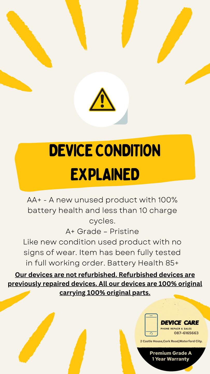 These devices are in like new, Grade A+ condition β they show minimal signs of usage and come with 12 monthsβ warranty. Our Grade A+ devices are pre-owned with original parts (i.e., not refurbished). They come with a battery health rating of 80%-100%.